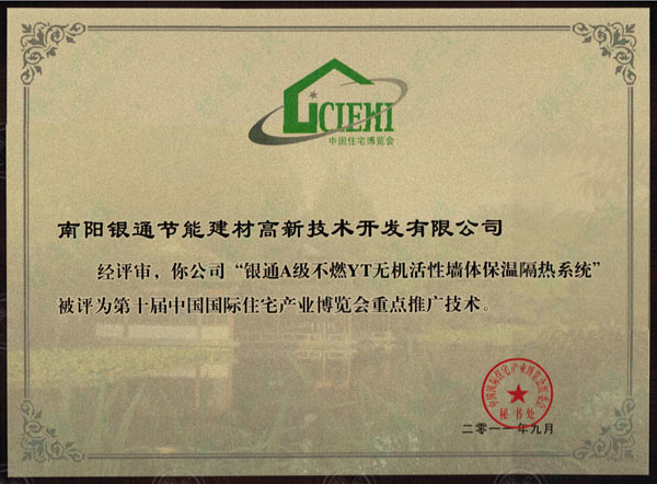 南陽銀通節能建材高新技術開發有限公司 經評審,你公司“銀通A級不燃YT無機活性墻體保溫隔熱系統”被評為第十屆中國國際住宅產業博覽會重點推廣技術。 中國國際住宅產業博覽會組委會 秘書處 二零一一年九月 第十屆中國國際住宅產業博覽會重點推廣技術
