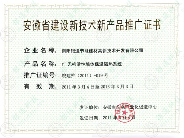 南陽(yáng)銀通安徽省建設(shè)新技術(shù)新產(chǎn)品推廣證書 企業(yè)名稱:YT無(wú)機(jī)活性墻體保溫隔熱系統(tǒng) 推廣證編號(hào):皖建推(2011)-019號(hào) 有效期:2011年3月4日至2013年3月3日 發(fā)證單位:安徽省住宅產(chǎn)業(yè)化促進(jìn)中心 發(fā)證日期:2011年3月4日