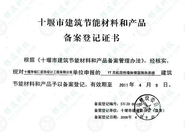 十堰市建筑節能材料和產品備案登記證書 根據《十堰市建筑節能材料和產品備案管理辦法》,經核實,現對十堰市銘仁裝飾設計工程有限公司單位申報的YT無機活性墻體保溫隔熱系統建筑節能材料和產品予以備案登記。有效期至2011年4月9日。 備案登記編號:SY2009-05號 備案登記單位:十堰市建設委員會 備案登記日期:2009年4月9日