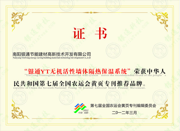 證書 南陽銀通節(jié)能建材高新技術(shù)開發(fā)有限公司 “銀通YT無機(jī)活性墻體隔熱保溫系統(tǒng)”榮獲中華人民共和國第七屆全國農(nóng)運(yùn)會(huì)黃頁專刊推薦品牌。 第七屆全國農(nóng)運(yùn)會(huì)黃頁?庉嬑瘑T會(huì) 二零一二年三月