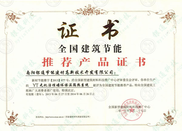 新材節(jié)能推字【2013】077號:經(jīng)全國新型建筑材料科技推廣中心評審委員會評審,你單位生產(chǎn)的YT無機(jī)活性墻體保溫隔熱系統(tǒng)被評為全國建筑節(jié)能推薦產(chǎn)品,特向全國建筑工程和廣大消費(fèi)推廣使用,特頒此證。