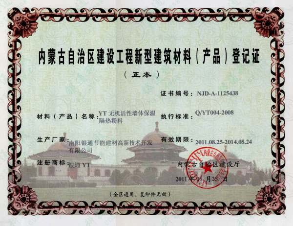 YT無機活性墻體保溫隔熱粉料 內蒙古自治區建設工程新型建筑材料(產品)登記證 有效期限:2011.8.25-2014.8.24