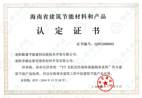 此證書為歷年曾獲證書,本介紹頁僅為方便用戶了解查詢企業(yè)歷史資質,望悉知 海南省建筑節(jié)能產品核準證書 有效期兩年,截至日期 2010年12月10日