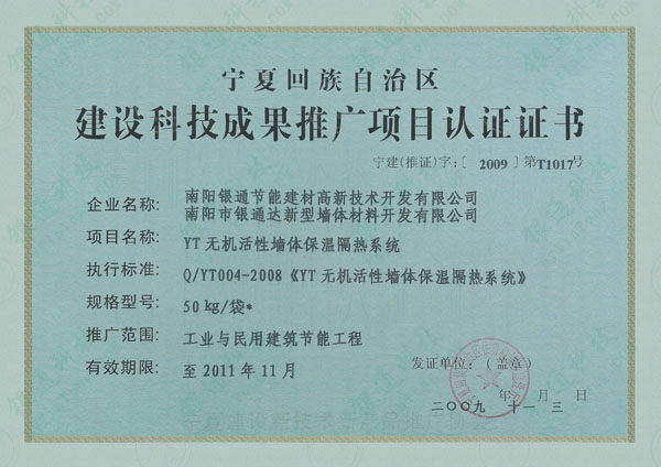 寧夏回族自治區(qū)建筑節(jié)能產品核準證書 有效期限 至2011年11月 頒發(fā)日期:2009年11月3日