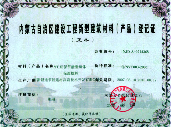 內蒙古省建筑節(jié)能產(chǎn)品核準證書 有效期限:2007.08.18-2010.08.17