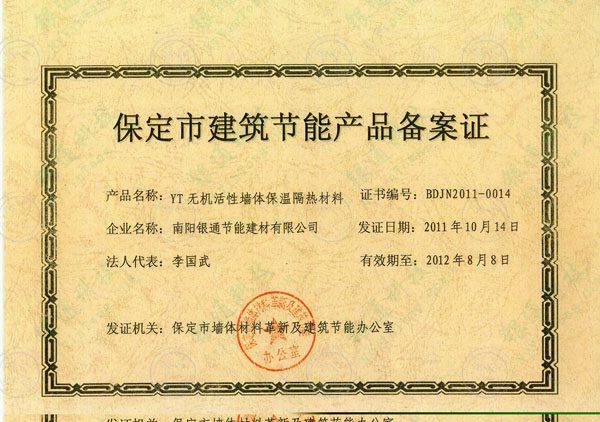 河北保定市建筑節能產品備案證 產品名稱 YT無機活性墻體保溫隔熱材料 證書編號BDJN2011-0014 企業名稱 南陽銀通節能建材有限公司 發證日期2011年10月14日 有效期至2012年8月8日 發證機關 保定市墻體材料革新及建筑節能辦公室