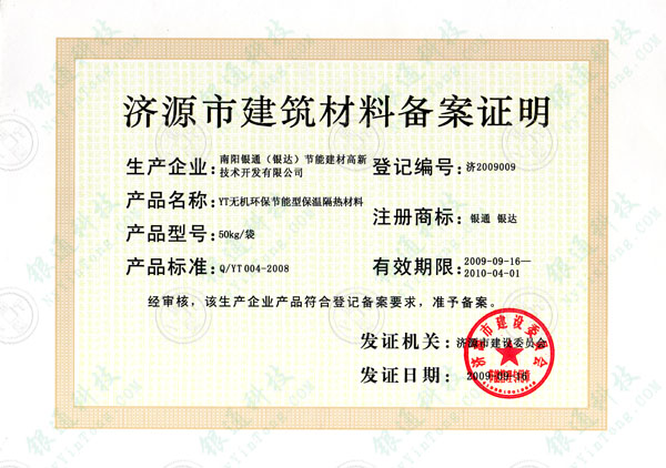 河南省濟源市建筑材料備案證明 備案編號濟2009009 企業名稱南陽銀通節能建材高新技術開發有限公司 南陽市銀達新型墻體材料開發有限公司 產品名稱YT無機環保節能型墻體保溫材料 規格型號YT-A 產品型號50kg/袋注冊商標銀通 銀達 產品標準Q/YT004-2008 有效期限2009年9月16日至2010年4月1日 經審核,該生產企業產品符合登記備案要求 準予備案 發證機關濟源市建設委員會 濟源市建設委員會節能管理專用章