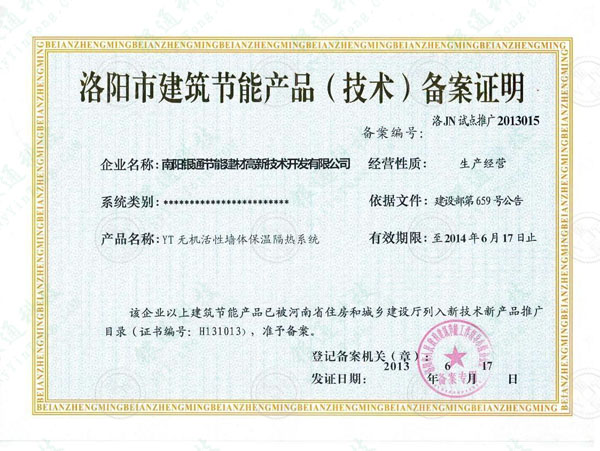 洛陽市建筑節能產品(技術)備案證明 備案編號:洛JN試點推廣2013015 企業名稱:南陽銀通節能建材高新技術開發有限公司 經營性質:生產經營 依據文件:建設部第659號公告 產品名稱:YT無機活性墻體保溫隔熱系統 有效期限:至2013年6月16日止 該企業以上建筑節能產品已被河南省住房和城鄉建設廳列入新技術新產品推廣目錄(證書編號:H131013),準予備案。 等級備案機關(章):洛陽市人民政府建筑節能工作領導小組辦公室 備案專用 發證日期:2013年06月17日