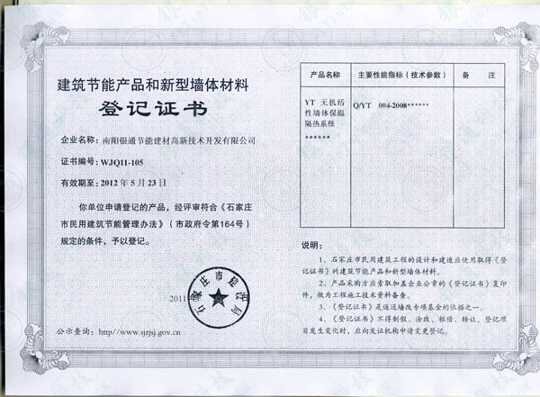 河北石家莊市建筑節(jié)能產(chǎn)品和新型墻體材料登記證書(shū) 企業(yè)名稱 南陽(yáng)銀通節(jié)能建材高新技術(shù)開(kāi)發(fā)有限公司證書(shū)編號(hào)WJQ11-105有效期至2012年5月23日 你單位申請(qǐng)登記的產(chǎn)品 經(jīng)評(píng)審符合石家莊市民用建筑節(jié)能管理辦法 市政府令第164號(hào)規(guī)定的條件 予以登記 石家莊市建設(shè)局 產(chǎn)品名稱 YT無(wú)機(jī)活性墻體保溫隔熱系統(tǒng) 主要性能指標(biāo)技術(shù)參數(shù) Q/YT004-2008