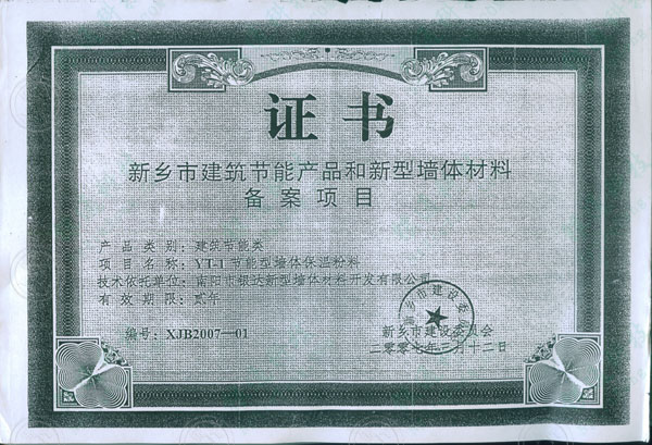 河南省新鄉市建筑節能產品和新型墻體材料備案證書  企業名稱 南陽市銀達新型墻體材料開發有限公司 單位地址 南陽市機場南路312國道西側 產品名稱YT無機活性墻體保溫隔熱系統  系統類別無機活性墻體保溫隔熱系統 證書編號XJB2007--01 有效期限二年 規格型號YT-A 產品型號50kg/袋 注冊商標銀通 銀達  登記備案機關 濮陽市建設委員會 發證日期2007年3月12日