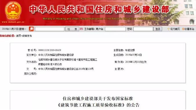 《建筑節能工程施工質量驗收標準》為國家標準,編號為GB50411-2019,自2019年12月1日起實施。