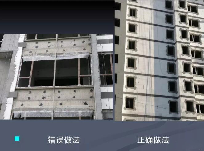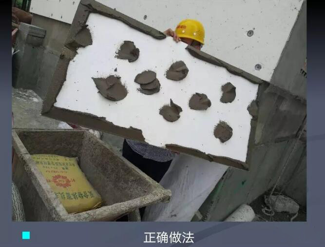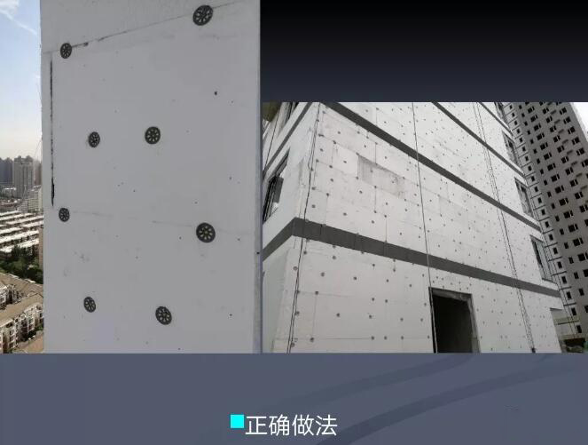 正確做法:玻纖網(wǎng)要夾在抹面層中間,即先把底面抹勻再掛玻纖網(wǎng),再抹一邊砂漿。抹面層保護(hù)保溫層并起著防裂防水抗沖擊和一定防火作用。