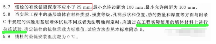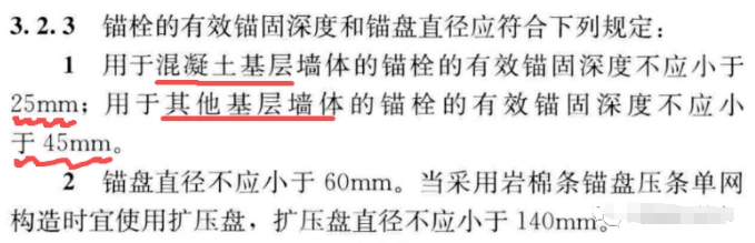 混凝土基層墻體的錨栓有效錨固深度不應小于25mm,其他基層墻體的錨栓有效錨固深度不應小于45mm;