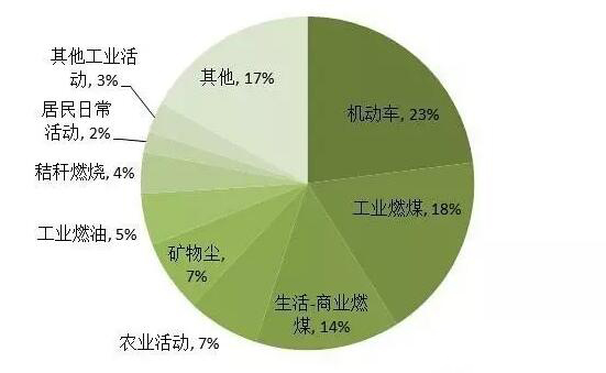 分析顯示,北京細顆粒物PM2.5 中大多是直徑小于1微米的超細顆粒物PM1,它的來源非常復雜。其中來自工業燃煤和生活燃煤的排放各貢獻約18%和14%、機動車貢獻23%、居民日常生活及其他活動占了約19%,剩下的是其他人類活動和自然界產生的。