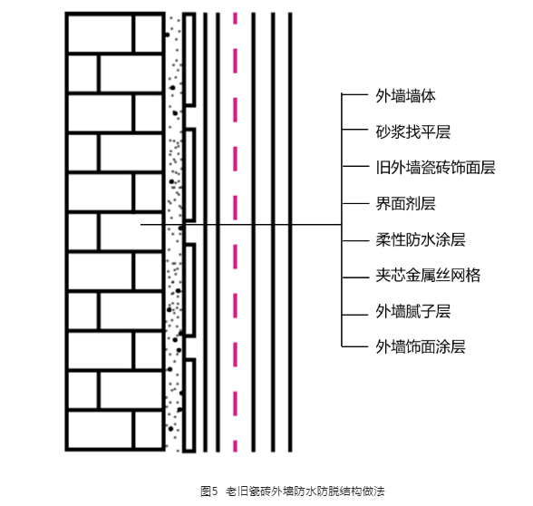 針對老舊小區外墻脫落問題,筆者公司研發了一種老舊瓷磚外墻防水防脫施工工藝,該工藝已經在海南省舊改外墻項目大量應用,均取得較好的施工效果,也申請了國家知識產權局的“實用新型專利”。該老舊瓷磚外墻防水防脫結構做法見圖5。