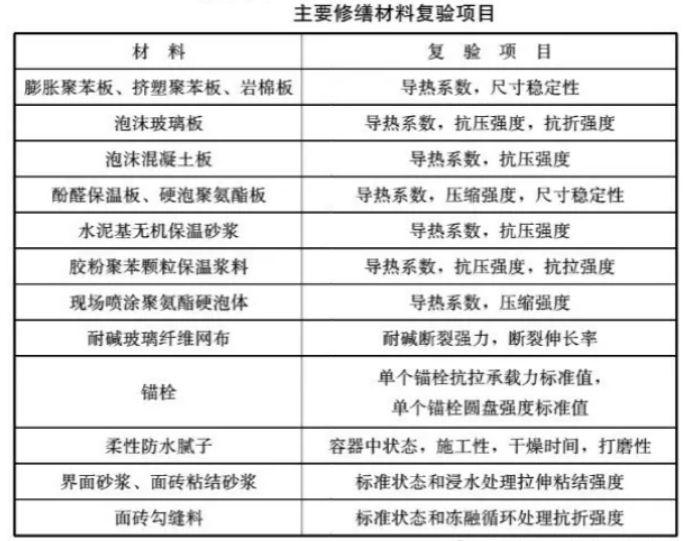 進場驗收+監(jiān)理見證取樣復(fù)驗(修復(fù)面積合計≥1000㎡時)+外墻外保溫粘貼拉拔試驗(修復(fù)面積合計≥1000㎡時)+紅外熱工缺陷檢測