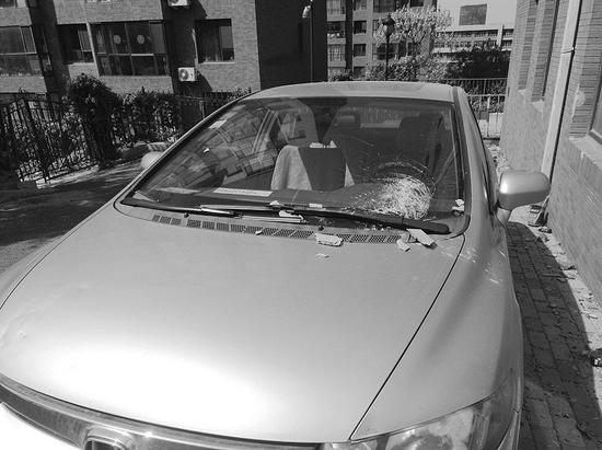 今年5月中旬的一個傍晚,從市外趕回家的董先生照常把車停在老地方,“那時候沒有警戒線,我也不知道不能停在那里。第二天傍晚,熱心鄰居通過車上留的電話聯系我,說車被砸了。”董先生說,得到消息后,他立刻到現場查看,此時前擋風玻璃右下角碎成蜘蛛狀,機關蓋上散落著墻磚,也被砸出坑。“墻磚應該是用水泥砌在樓體上的,質感有點像瓷磚,還挺硬的。”董先生回憶道,眼前的景象讓他心驚不已,“幸好我當時沒在車附近,否則就沒命了。”董先生說,事后他也聯系過物業,但得到的說法和記者得到的一樣,董先生只好自認倒霉,花了3000元修理擋風玻璃和機關蓋,從此董先生就把車停在距離家10分鐘路程的地方。