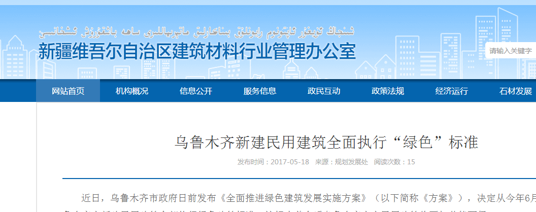近日,烏魯木齊市政府日前發布《全面推進綠色建筑發展實施方案》(以下簡稱《方案》),決定從今年6月1日起,烏魯木齊市新建民用建筑全部執行綠色建筑標準。這標志著今后烏魯木齊市市民用建筑將更加節能環保。